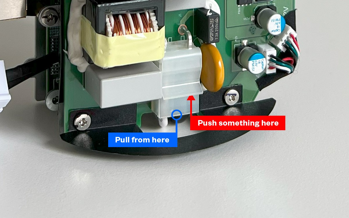 The power components can hold charge. Be extra careful not to touch them during disassembly or reassembly.