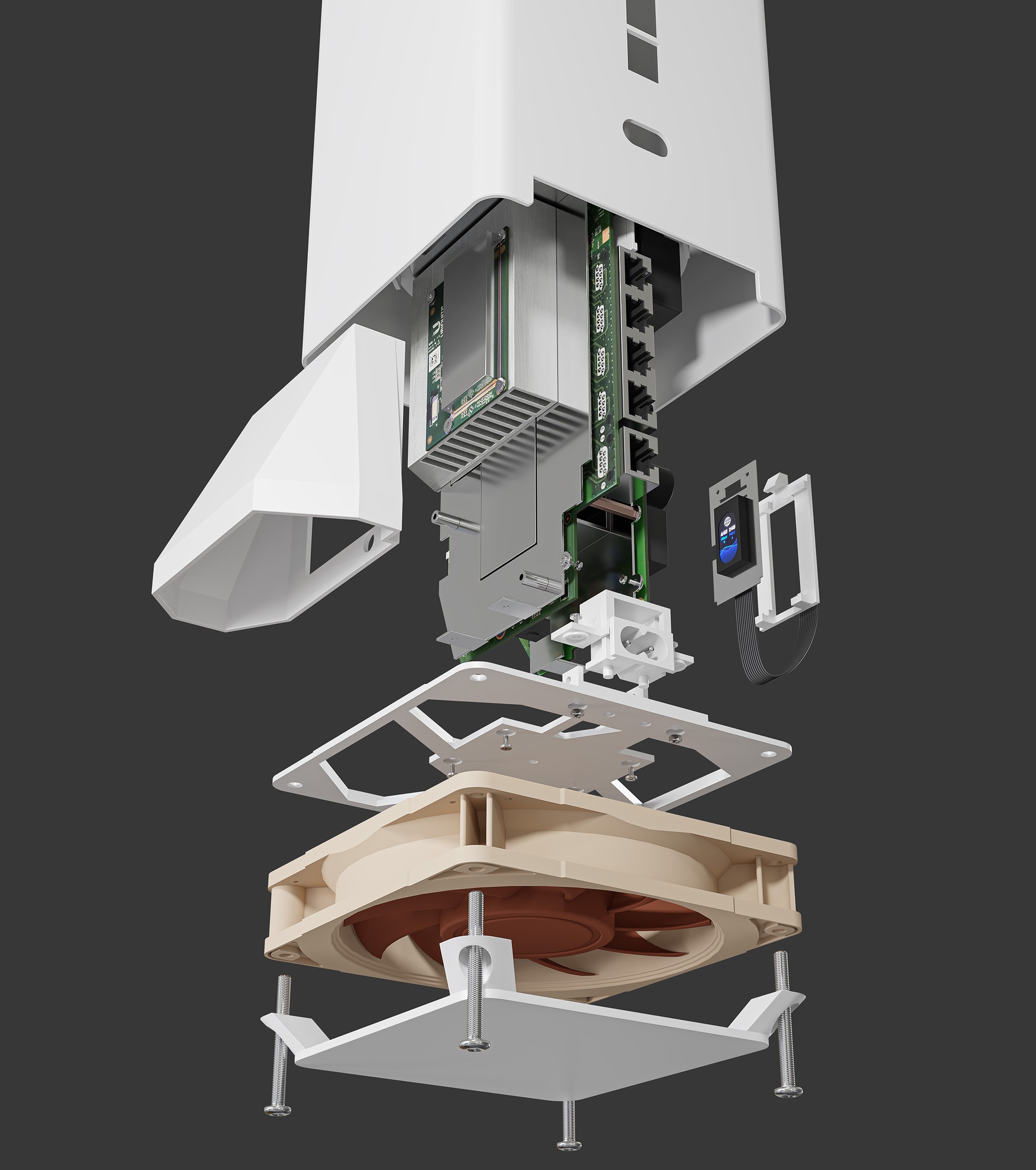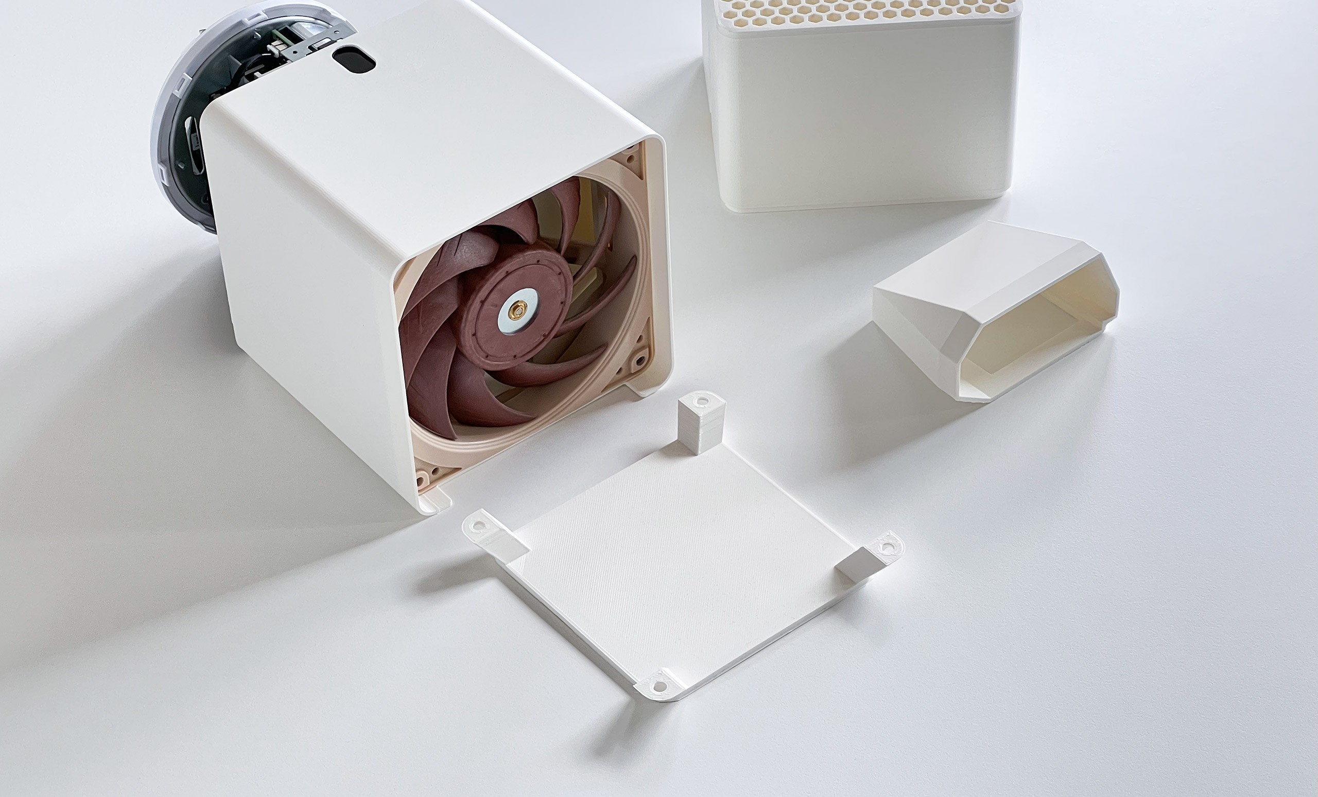 The design is extremely silent, and I have been running the unit since 2022 without any issues. Operating temperatures stay around 34–38 °C with the fan spinning at just 670 RPM. This setup also cools other components, including the power circuitry. I have not observed any decrease in Wi-Fi antenna performance compared to the original casing.